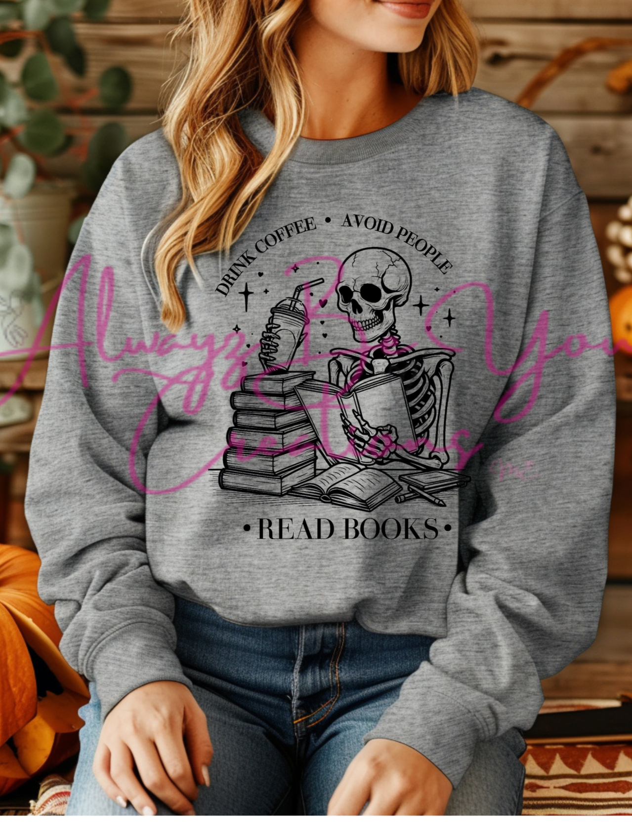 Beautiful "avoid people and read" sweatshirt. Perfect for cold days and snuggly nights. Made with Polyester and cotton.